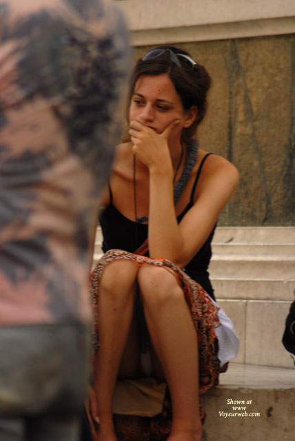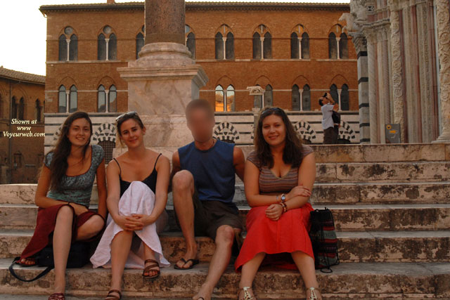 The weather is hot in Italy and women don't seem to care who might be looking up their skirts while sitting on the MANY steps the beautiful country boasts. I got lucky one after noon as I was taking photos of Siena's Duomo. These three girls had no idea I was taking photos of them and their friend with lace panties. When I was done alternating taking photos of the cathedral and then the upskirts, I asked if I could have my photo taken WITH them! I have more NUDE photos from Cinque Terre if you like these. Please vote for my cheeky request to pose with them! All voyeur shots were taken at about 10 meters distance with a powerful zoom. My apologies for the blurry shots, I was moving my camera quickly back towards the Duomo. I am in blue and this goes out to my lads from 1103 - enjoy boys!